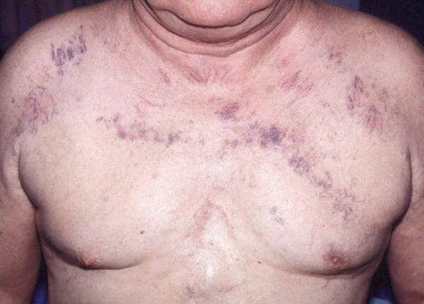Spider veins can occur anywhere on the body and most commonly occur on the legs but they also commonly occur on the face and chest. Spider Veins on the face and torso have different causes. Spider Veins on the face are often caused by sun damage, rosacea, and skin diseases [lupus, scleroderma] or in response to medications like steroids. Spider veins that occur on the chest and trunk may be caused by sun damage or they can be related to certain diseases like cirrhosis of the liver or pregnancy. Or chest and trunk spider veins can be the result of a combination of the above.